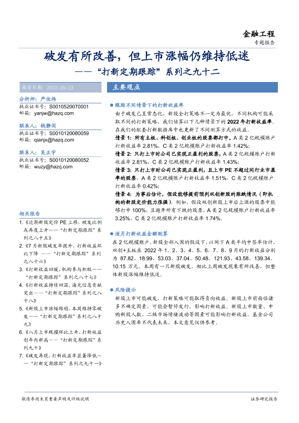 打新跟踪 新股表现 证券研究 资本市场 金融分析