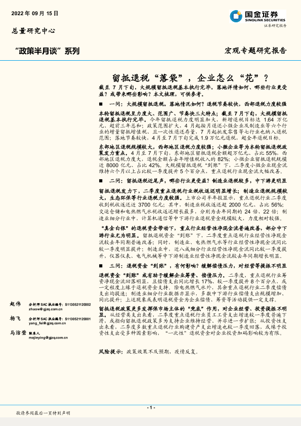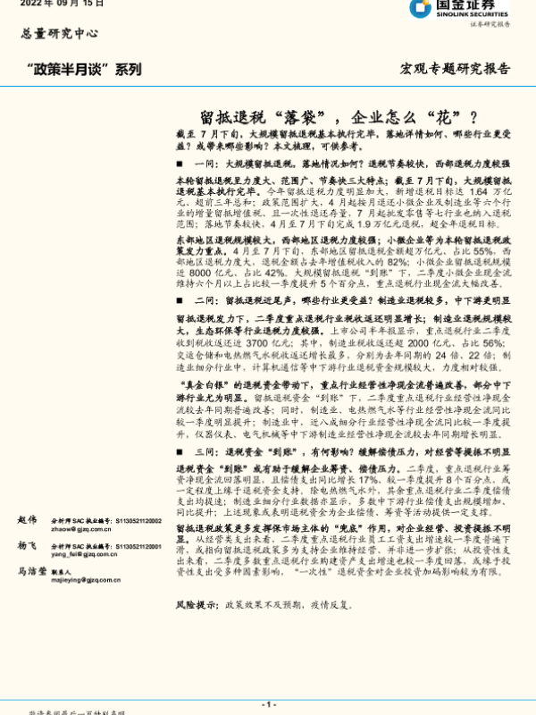 【国金证券】【20220915】“政策半月谈”系列:留抵退税“落袋”,企业怎么“花”?-17页