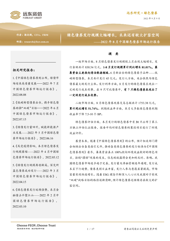 【远东资信】【20220909】2022年8月中国绿色债券市场运行报告:绿色债券发行规模大幅增长,未来还有较大扩容空间-17页