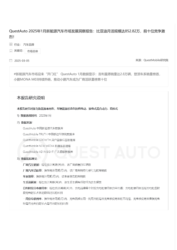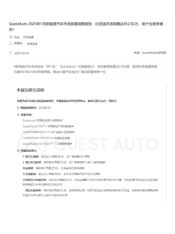 【QuestMobile研究院】【20250305】2025年1月新能源汽车市场发展洞察报告:比亚迪月活规模达852.82万,前十位竞争激烈!-20页