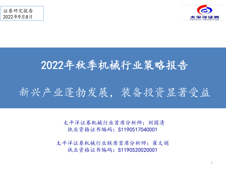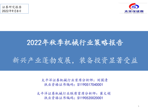 【太平洋证券】【20220908】2022年秋季机械行业策略报告:新兴产业蓬勃发展,装备投资显著受益-43页