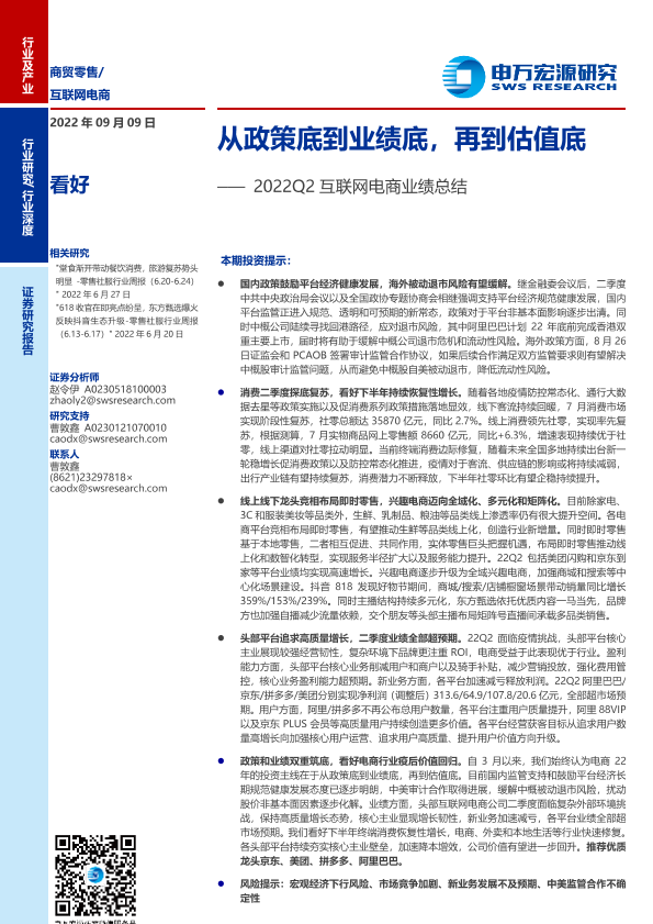 【申万宏源】【20220909】2022Q2互联网电商行业业绩总结:从政策底到业绩底,再到估值底-26页