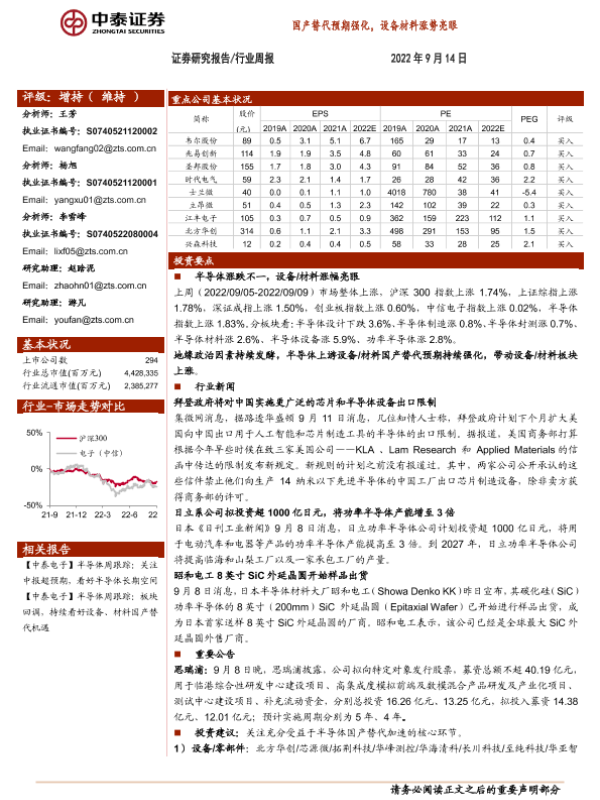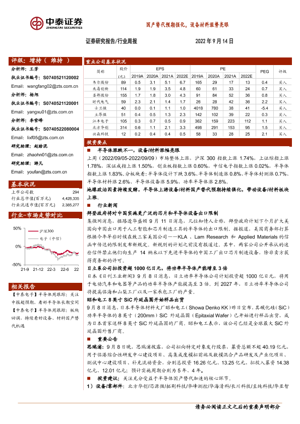 【中泰证券】【20220914】半导体行业周报:国产替代预期强化,设备材料涨势亮眼-12页