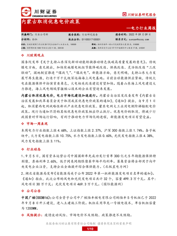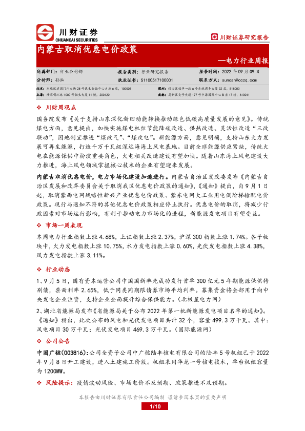 【川财证券】【20220909】电力行业周报:内蒙古取消优惠电价政策-10页