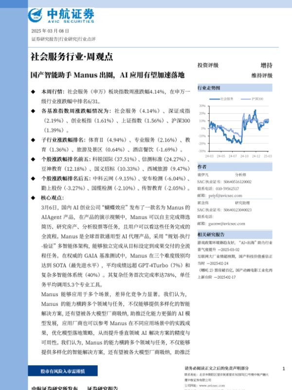 【中航证券】【20250308】社会服务行业·周观点:国产智能助手Manus出圈,AI应用有望加速落地-10页