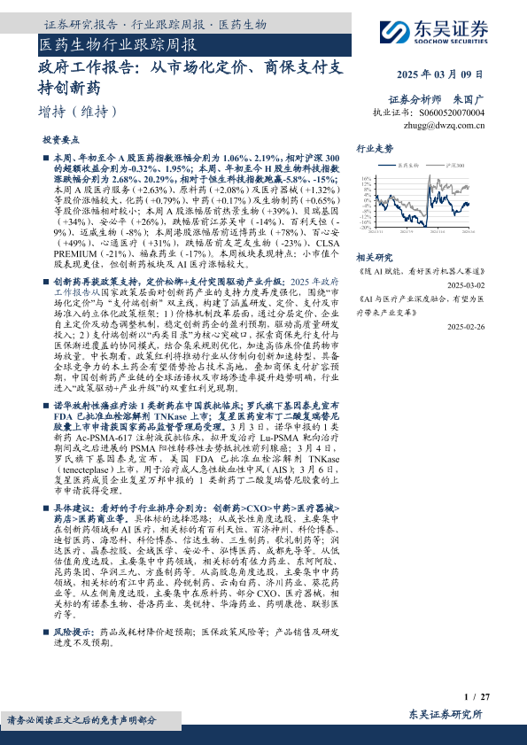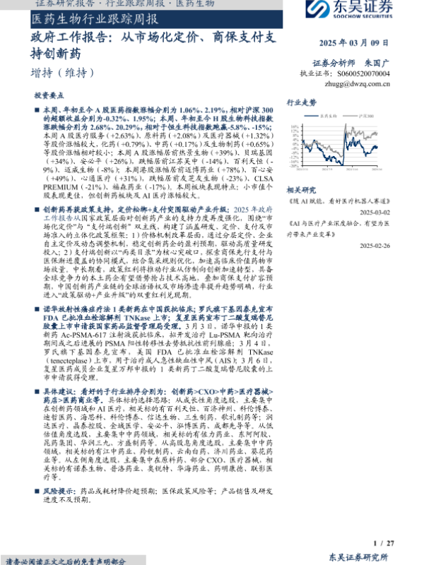 【东吴证券】【20250309】20250309-东吴证券-医药生物行业跟踪周报:政府工作报告:从市场化定价、商保支付支持创新药-27页