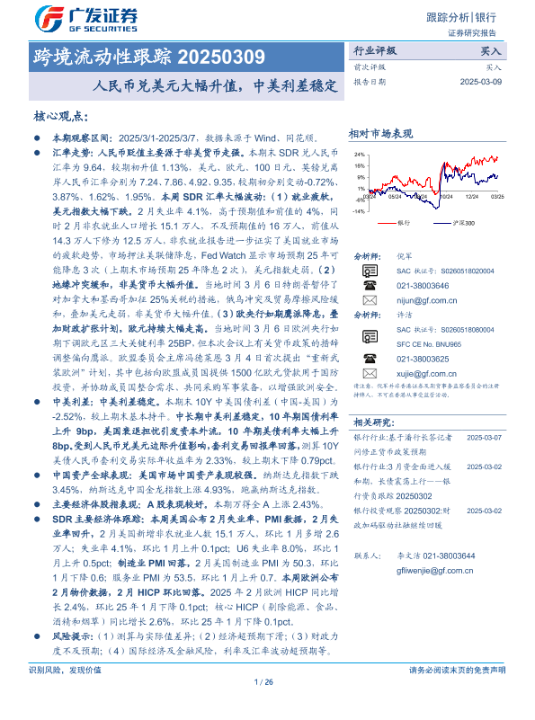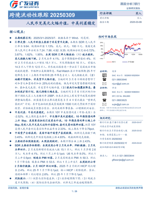 【广发证券】【20250309】银行跨境流动性跟踪:人民币兑美元大幅升值,中美利差稳定-26页