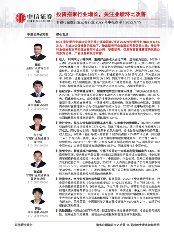 【中信证券】【20220915】非银行金融行业证券行业2022年中报点评:投资拖累行业增长,关注业绩环比改善-19页