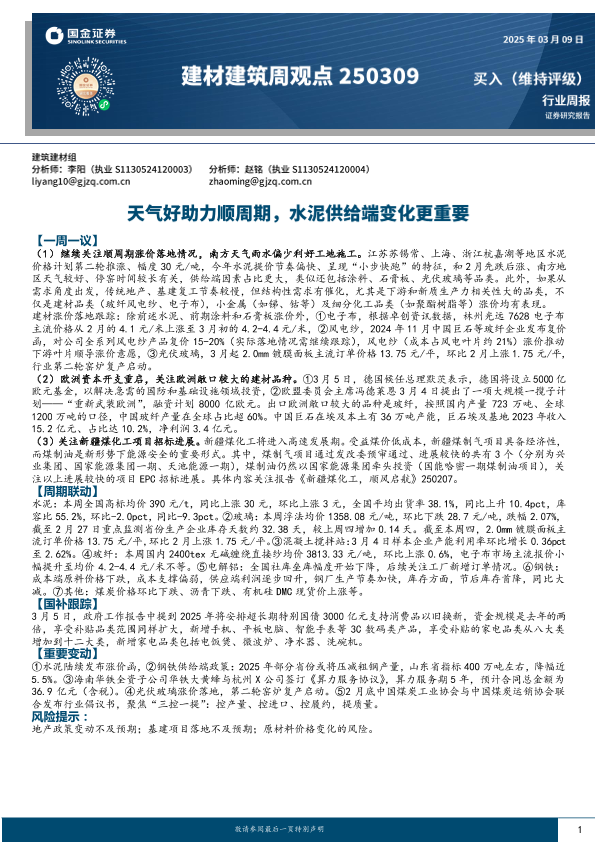 【国金证券】【20250309】国金证券-建材建筑周观点:天气好助力顺周期,水泥供给端变化更重要-21页