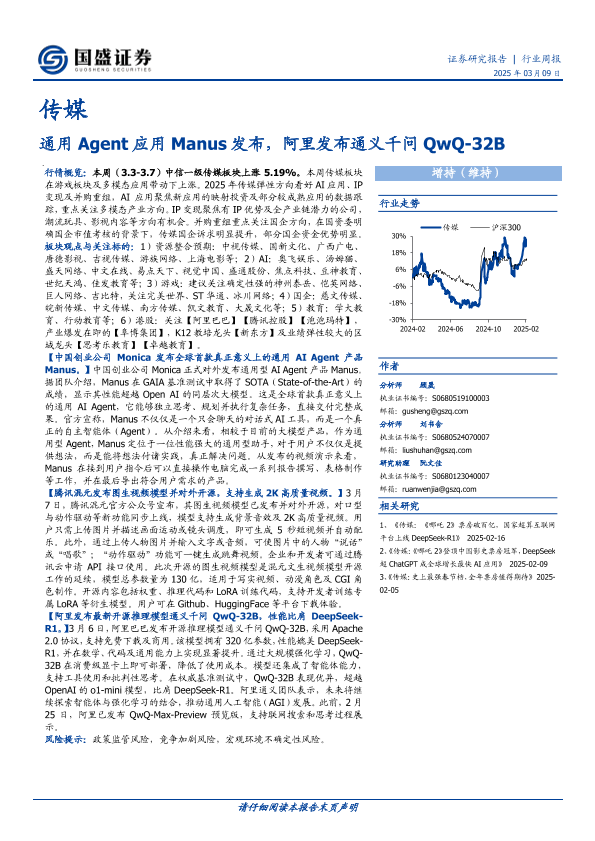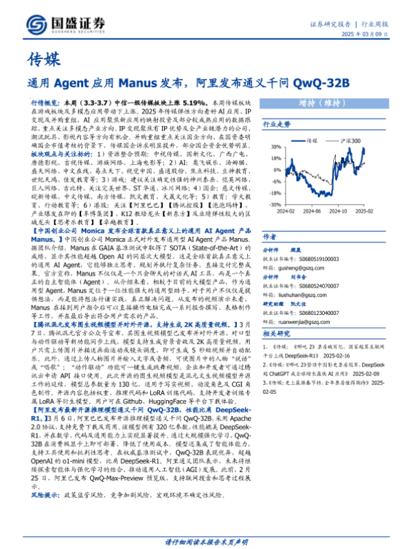 【国盛证券】【20250309】20250309-国盛证券-传媒行业周报:通用Agent应用Manus发布,阿里发布通义千问QwQ-32B-10页