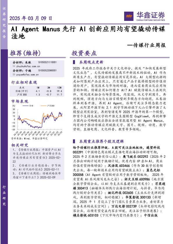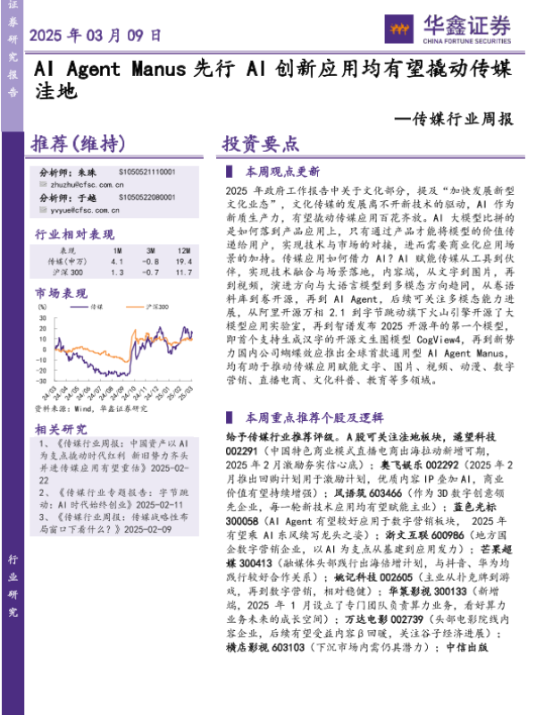 【华鑫证券】【20250309】20250309-华鑫证券-传媒行业周报:AI Agent Manus先行AI创新应用均有望撬动传媒洼地-21页