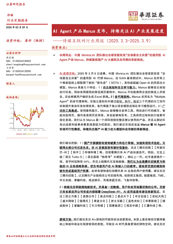 【华源证券】【20250309】20250309-华源证券-传媒互联网行业周报:AI Agent产品Manus发布,持续关注AI产业发展进度-17页