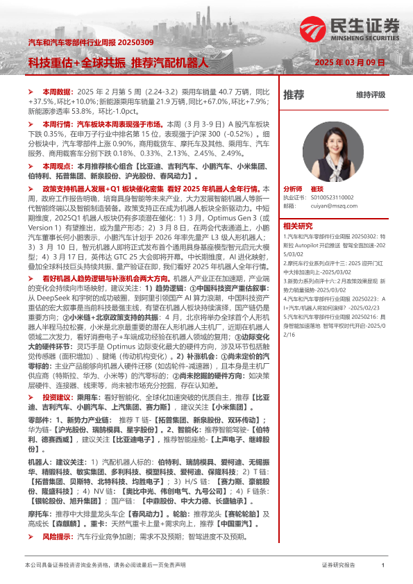 【民生证券】【20250309】汽车和汽车零部件行业周报:科技重估+全球共振 推荐汽配机器人-34页