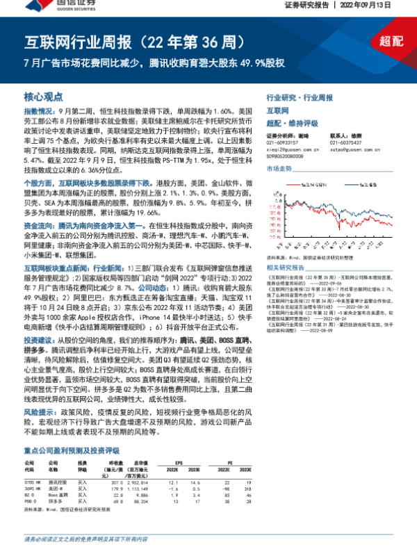 【国信证券】【20220913】互联网行业周报(22年第36周):7月广告市场花费同比减少,腾讯收购育碧大股东49.9%股权-13页