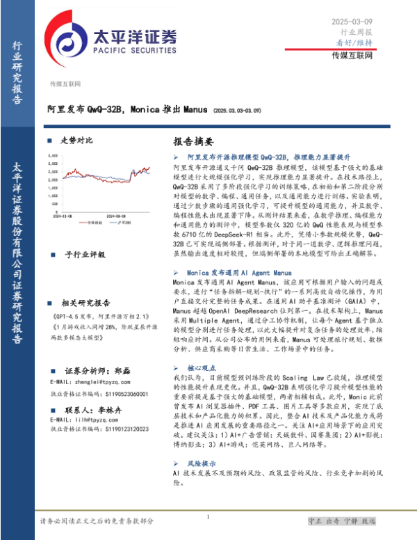 【太平洋证券】【20250309】20250309-太平洋-传媒互联网行业周报:阿里发布QwQ-32B,Monica推出Manus-20页