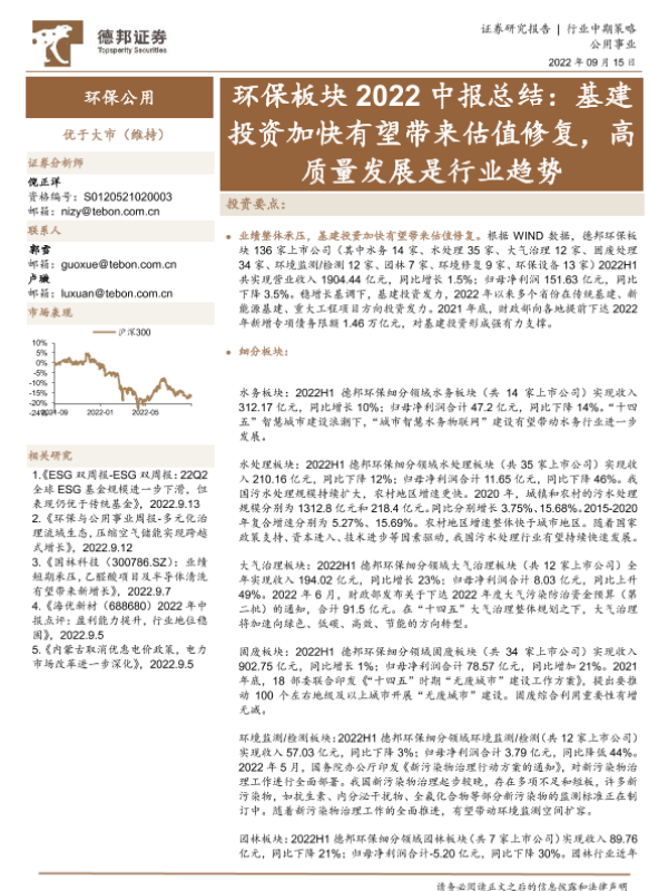 【德邦证券】【20220915】环保板块2022中报总结:基建投资加快有望带来估值修复,高质量发展是行业趋势-37页