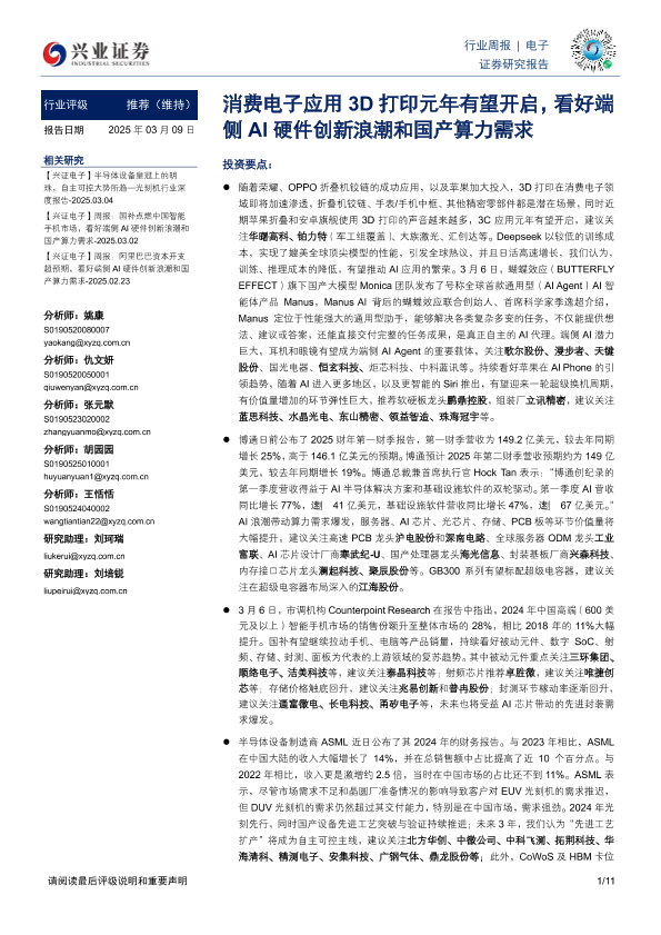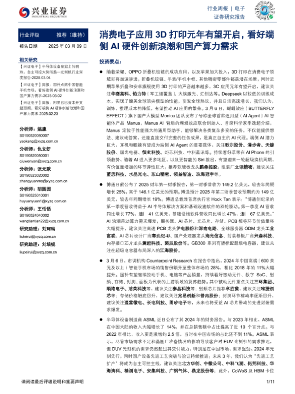 【兴业证券】【20250309】20250309-兴业证券-电子行业周报:消费电子应用3D打印元年有望开启,看好端侧AI硬件创新浪潮和国产算力需求-11页