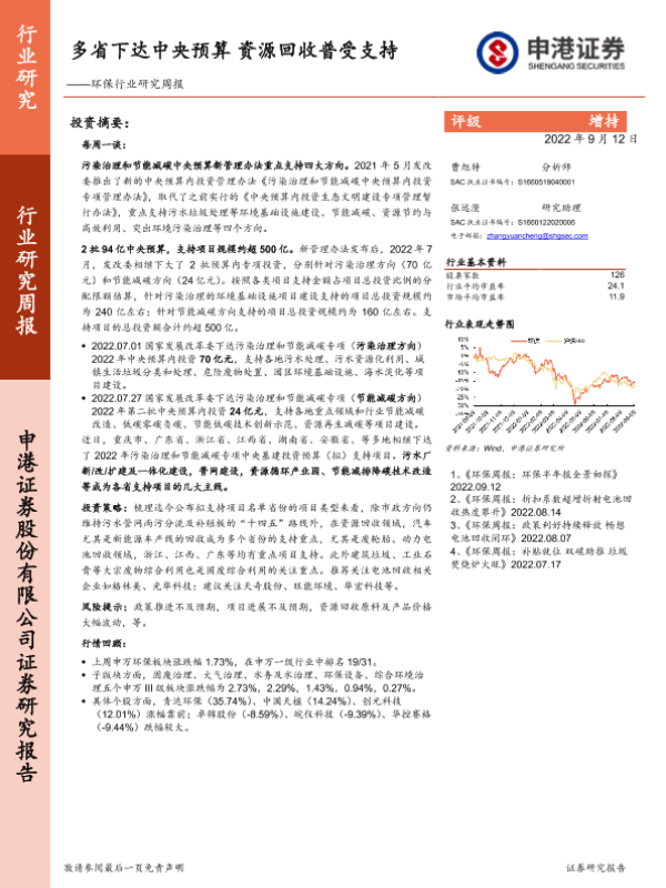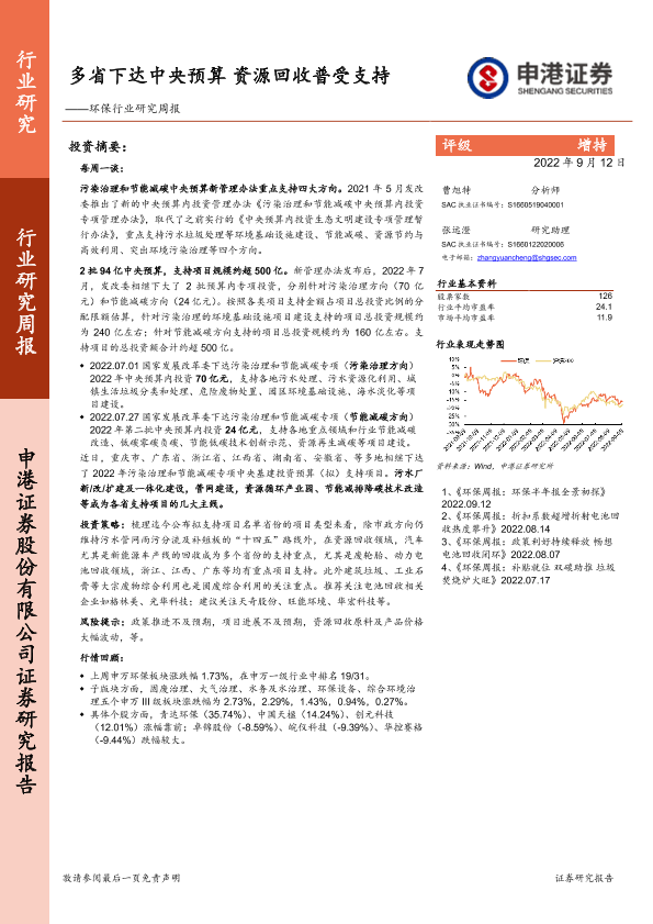 【申港证券】【20220912】环保行业研究周报:多省下达中央预算 资源回收普受支持-13页