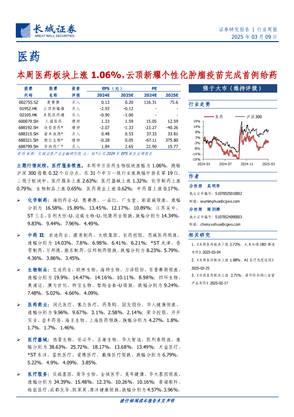 【长城证券】【20250309】医药行业周报:本周医药板块上涨1.06%,云顶新耀个性化肿瘤疫苗完成首例给药-15页