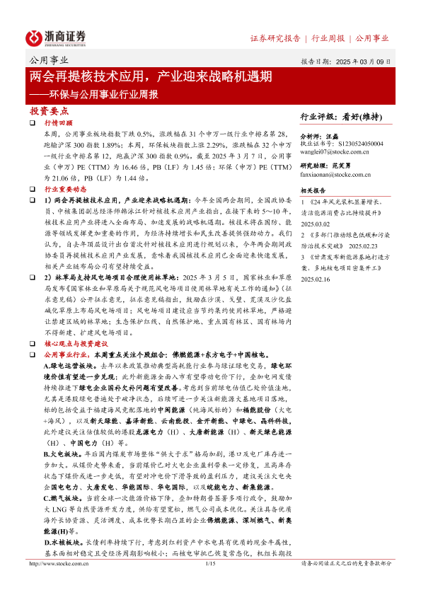 【浙商证券】【20250309】环保与公用事业行业周报:两会再提核技术应用,产业迎来战略机遇期-15页