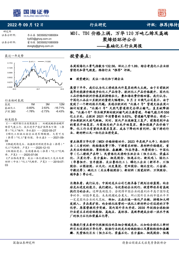 【国海证券】【20220912】基础化工行业周报:MDI、TDI价格上调,万华120万吨乙烯及高端聚烯烃环评公示-56页