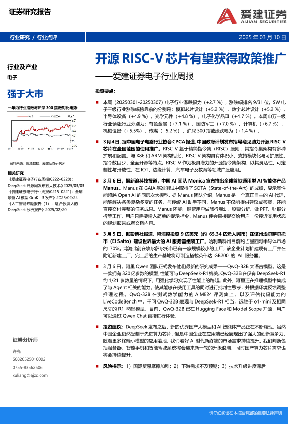 【爱建证券】【20250310】爱建证券-电子行业周报:开源RISC-V芯片有望获得政策推广-14页