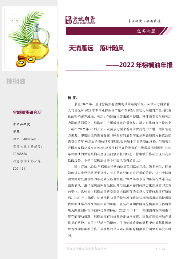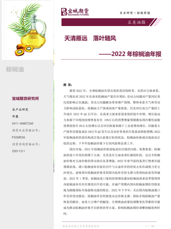 【宝城期货】【20220105】2022年棕榈油年报:天清雁远,落叶随风-33页