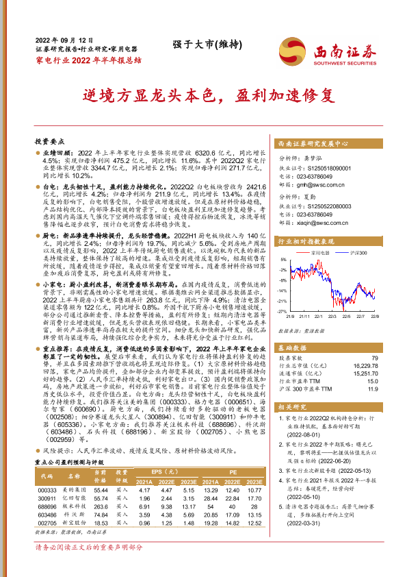 【西南证券】【20220912】家电行业2022年半年报总结:逆境方显龙头本色,盈利加速修复-22页