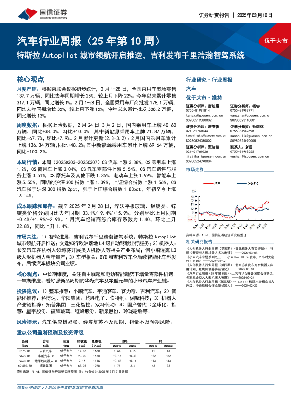 【国信证券】【20250310】20250310-国信证券-汽车行业周报(25年第10周):特斯拉Autopilot城市领航开启推送,吉利发布千里浩瀚智驾系统-30页