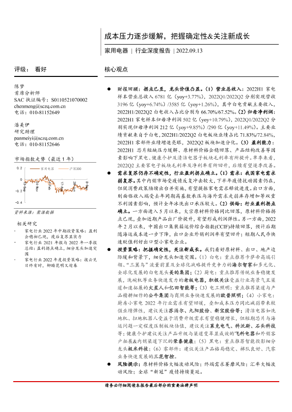 【首创证券】【20220913】家用电器行业深度报告:成本压力逐步缓解,把握确定性&关注新成长-34页