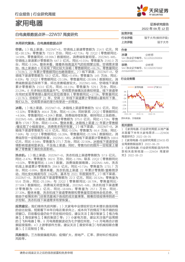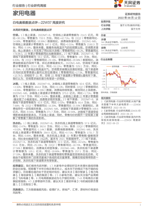 【孙谦】【20220912】家用电器行业22W37周度研究:白电奥维数据点评-17页