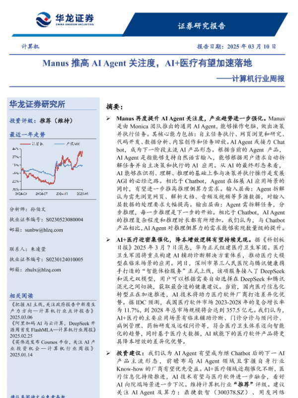 【华龙证券】【20250310】计算机行业周报:Manus推高AI Agent关注度,AI+医疗有望加速落地-10页