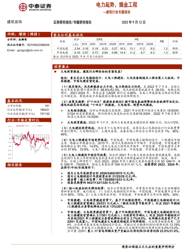 中泰证券 市场分析 建筑行业 火电投资 电力工程