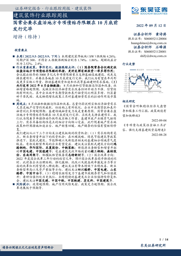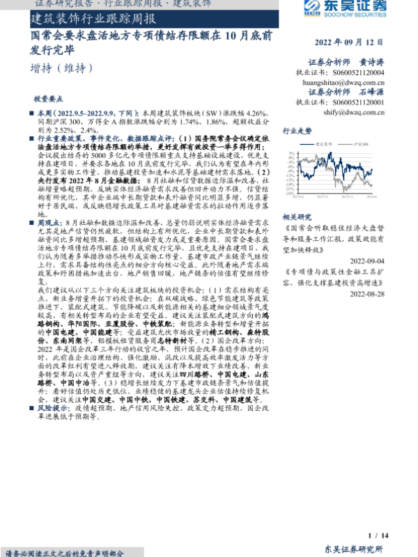 【东吴证券】【20220912】建筑装饰行业跟踪周报:国常会要求盘活地方专项债结存限额在10月底前发行完毕-14页