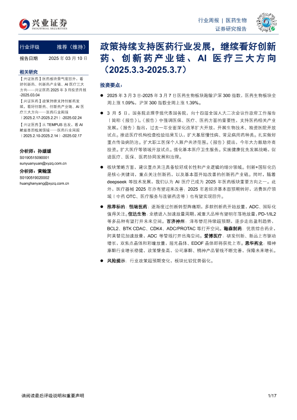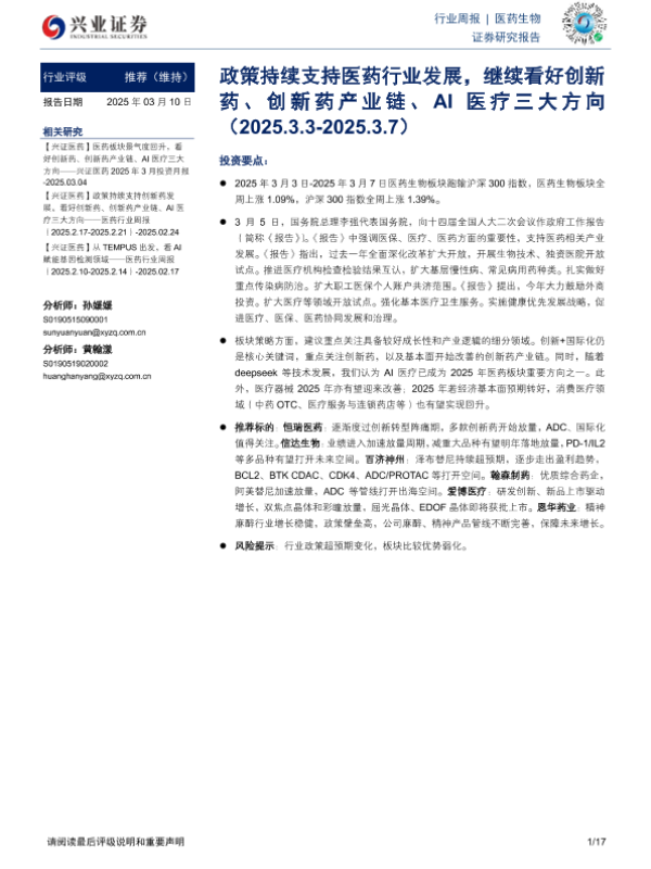 【兴业证券】【20250310】20250310-兴业证券-医药生物行业周报:政策持续支持医药行业发展,继续看好创新药、创新药产业链、AI医疗三大方向-17页
