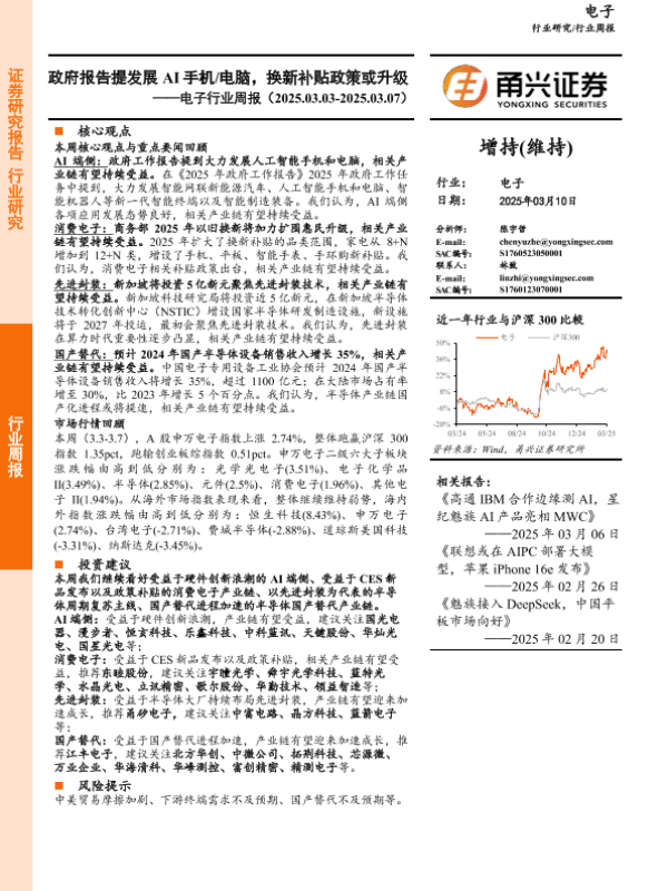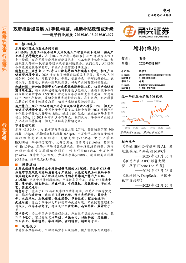 【甬兴证券】【20250310】20250310-甬兴证券-电子行业周报:政府报告提发展AI手机 电脑,换新补贴政策或升级-14页