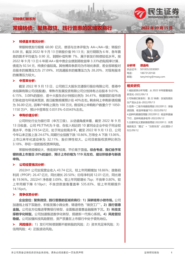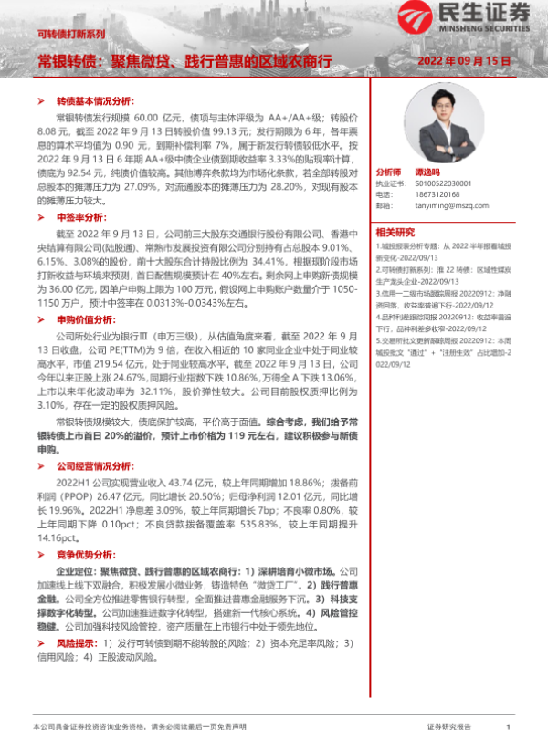 【民生证券】【20220915】可转债打新系列:常银转债,聚焦微贷、践行普惠的区域农商行-15页