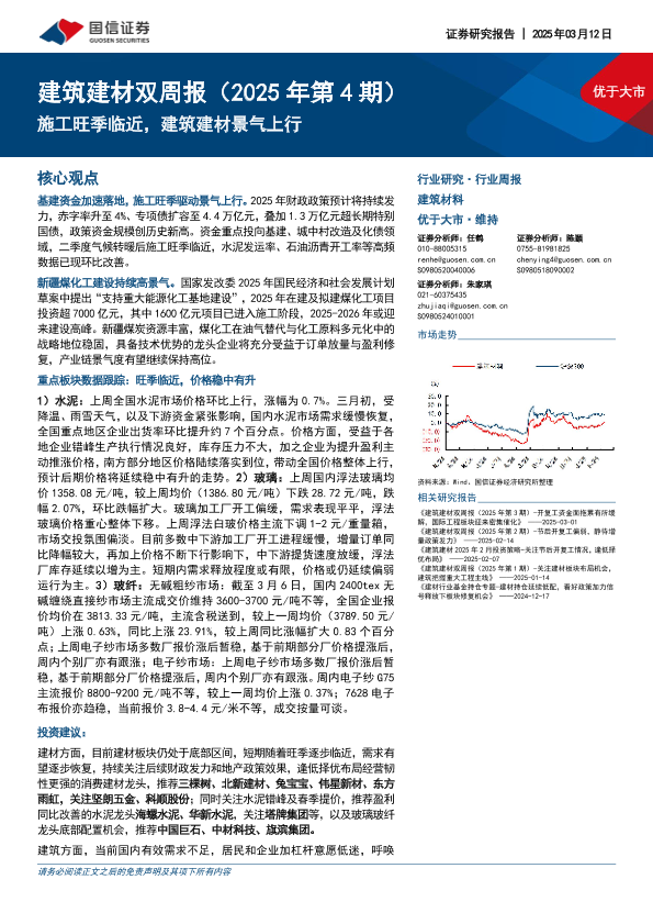 建筑建材 政策资金 施工旺季 水泥价格 玻璃市场