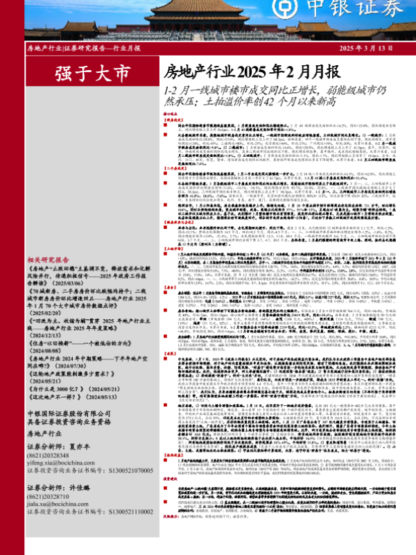 【中银证券】【20250313】房地产行业2025年2月月报:1-2月一线城市楼市成交同比正增长,弱能级城市仍然承压;土拍溢价率创42个月以来新高-25页