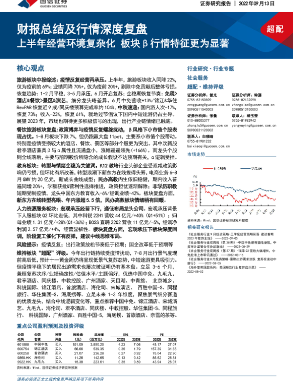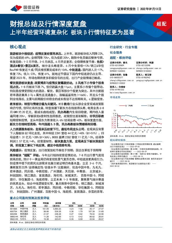【国信证券】【20220913】社会服务行业专题:财报总结及行情深度复盘-上半年经营环境复杂化 板块β行情特征更为显著-29页