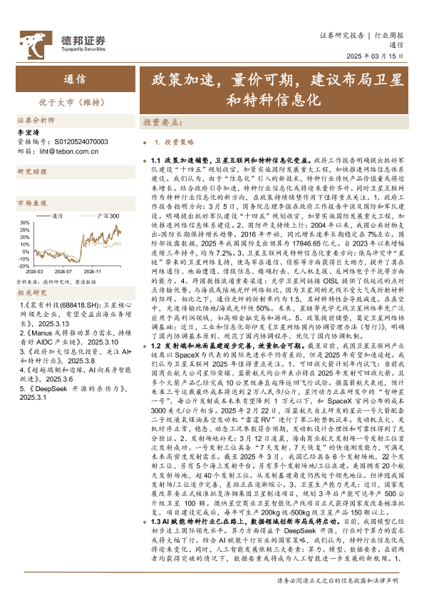 【德邦证券】【20250315】20250315-德邦证券-通信行业周报:政策加速,量价可期,建议布局卫星和特种信息化-18页