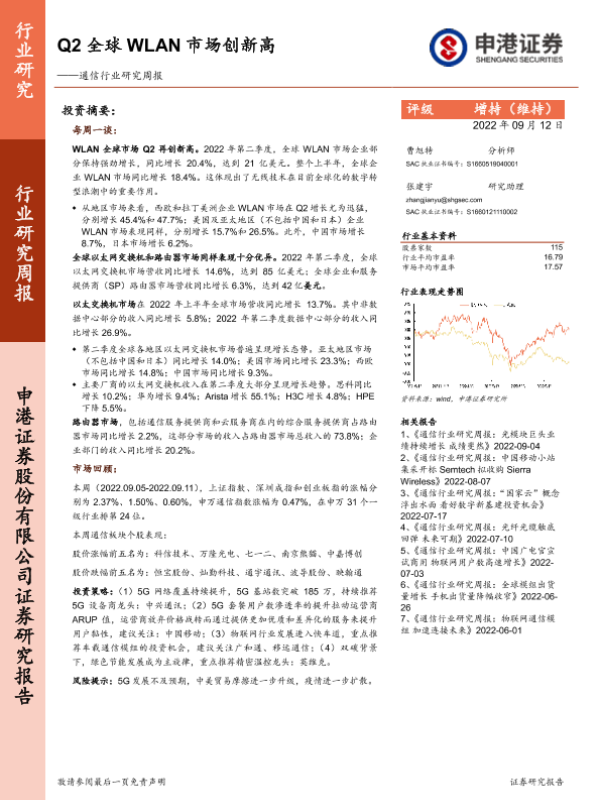 【申港证券】【20220912】通信行业研究周报:Q2全球WLAN市场创新高-14页