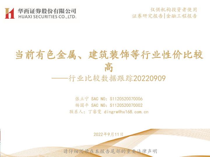 【华西证券】【20220911】行业比较数据跟踪:当前有色金属、建筑装饰等行业性价比较高-24页