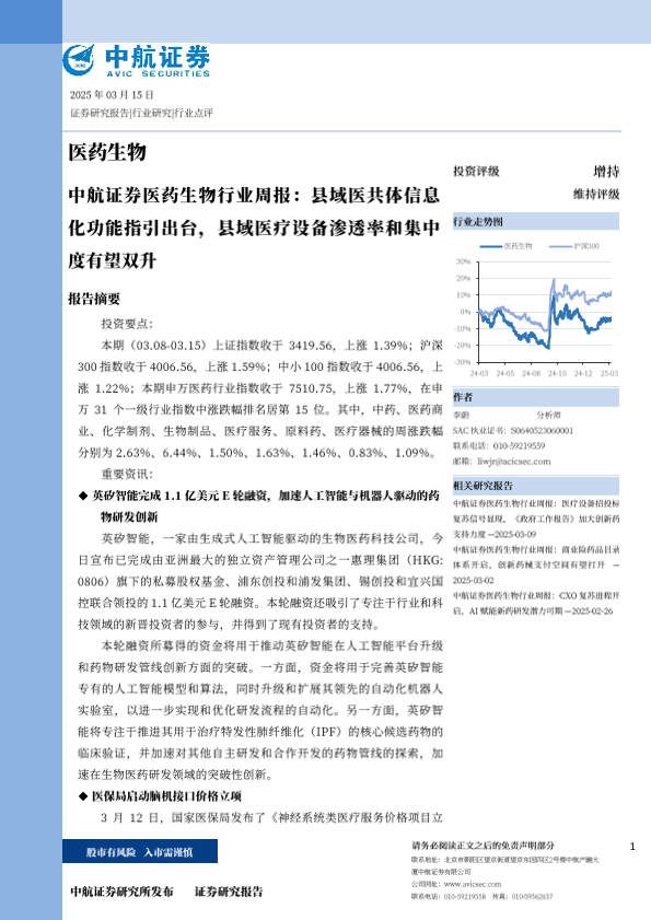 【中航证券】【20250315】医药生物行业周报:县域医共体信息化功能指引出台,县域医疗设备渗透率和集中度有望双升-14页