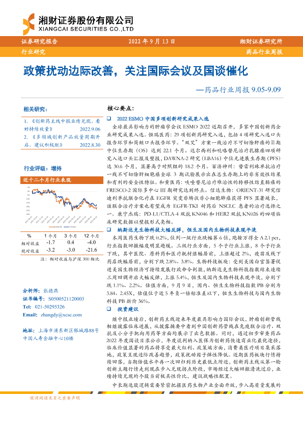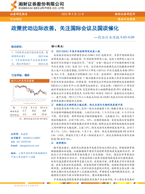 【湘财证券】【20220913】药品行业周报:政策扰动边际改善,关注国际会议及国谈催化-15页