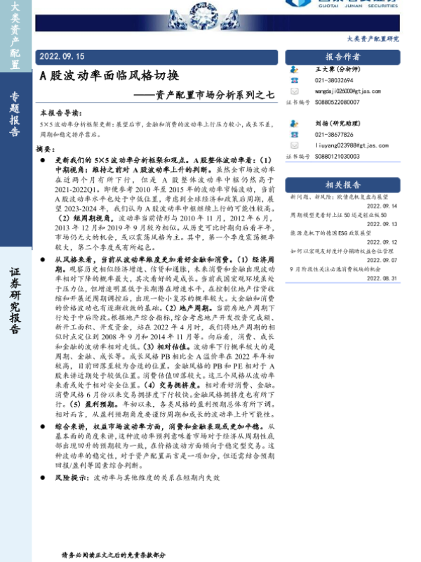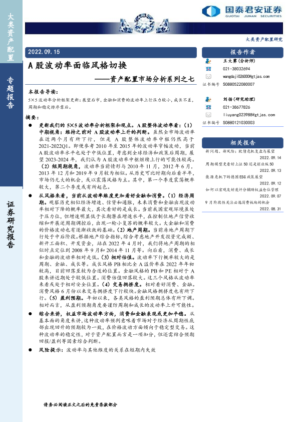 【国泰君安证券】【20220915】资产配置市场分析系列之七:A股波动率面临风格切换-15页
