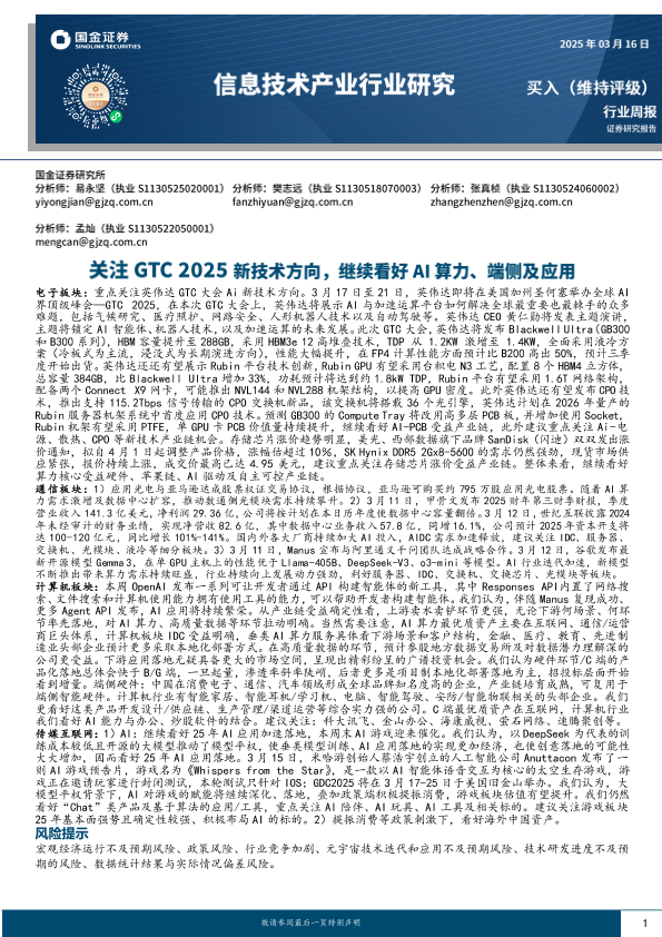 【国金证券】【20250316】信息技术产业行业研究:关注GTC 2025新技术方向,继续看好AI算力、端侧及应用-20页