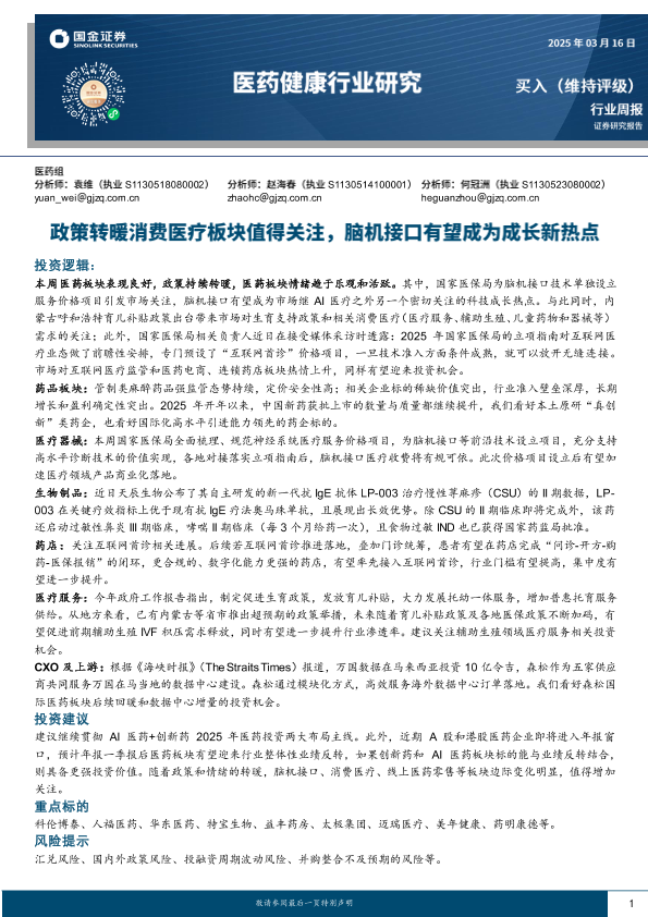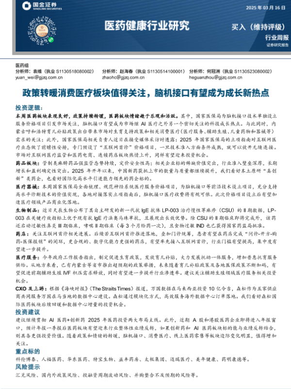 【国金证券】【20250316】20250316-国金证券-医药健康行业研究:政策转暖消费医疗板块值得关注,脑机接口有望成为成长新热点-15页