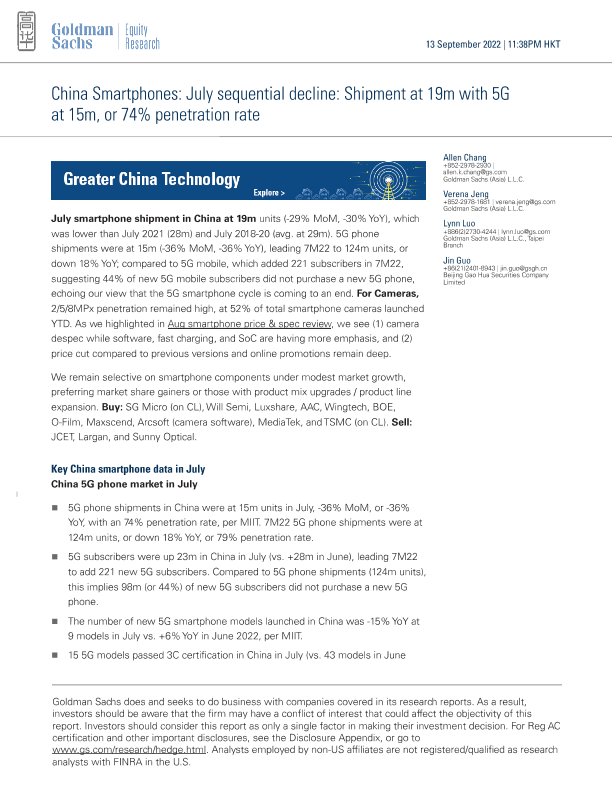 【Goldman Sachs】【20220913】China Smartphones July sequential decline Shipment at 19m with 5G at 15m, or 74% penetration rate-13页