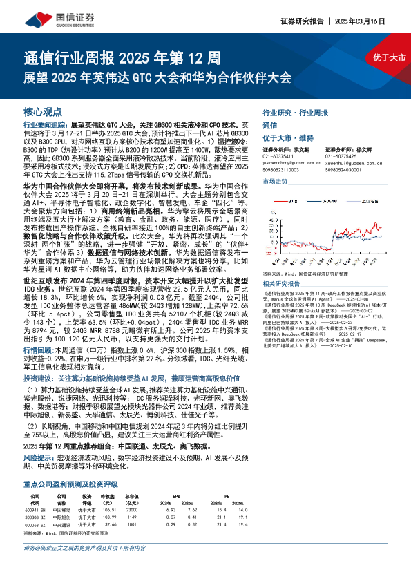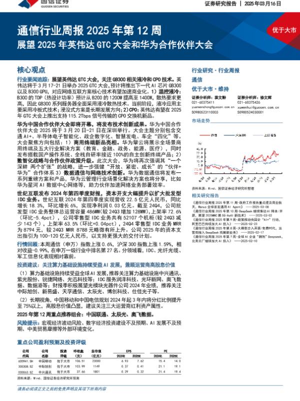 【国信证券】【20250316】通信行业周报2025年第12周:展望2025年英伟达GTC大会和华为合作伙伴大会-17页